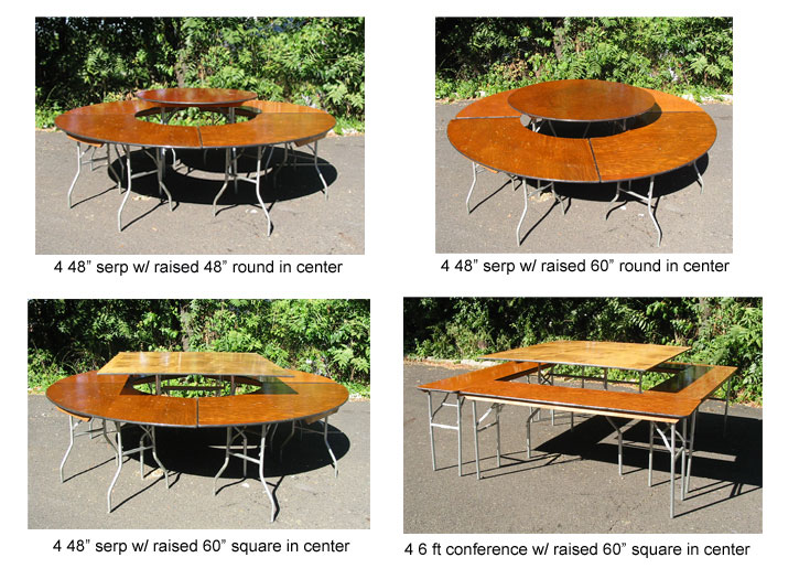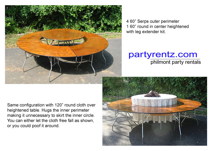 Please be aware that in the configurations below, because you are reaching over/behind the 30 inch width of the outer tables, the center of the interior elevated table is not easily accessible.The configurations are really designed for displays in the center.( Large centerpieces and visual displays that do not need to be accessed by guests.) The configuration at bottom right allows for the best center table access because the tables are 18 inch narrows. The overlapping configurations such as the 60 inch round in the center of 48 inch serps offer increased accessibility.